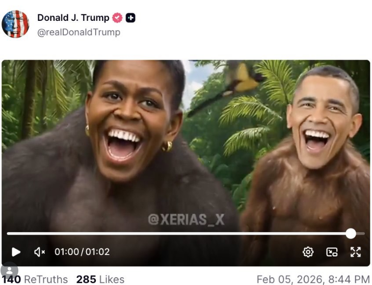 Donald Trump posted this racist video portraying the Obamas as apes on his Truth Social account. It was later deleted, but he refused to apologize for it. (Photo: ScreenCap)